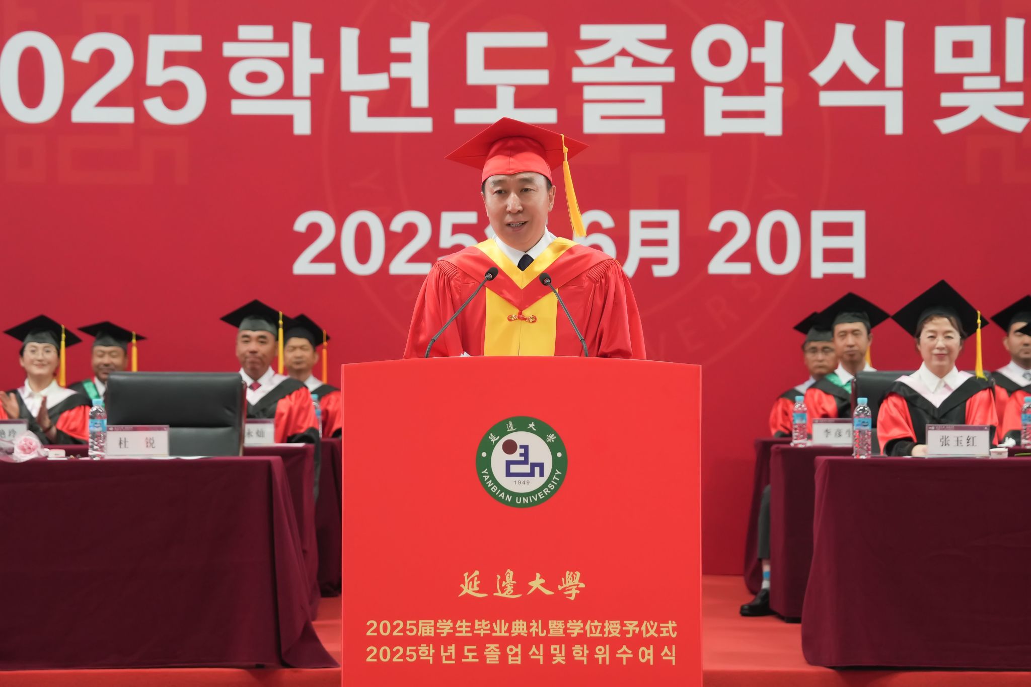 (通讯员 高子愉)六月骊歌起,青衿志可期。6月20日上午,我校2025届学生毕业典礼暨学位授予仪式在延吉校区体育馆举行。校党委常委班子成员,校友代表、2002届毕业生、吉林天衡药业有限公司董事长姜庆伟,校学位评定委员会委员,各相关部门负责人,教师代表、2025届毕业生代表和家长代表出席典礼。校党委书记、学位评定委员会主席杜锐在典礼上讲话,副校长刘岩主持典礼。杜锐以《赓续延大人荣光 绽放金达莱风采》为题,向全体毕...