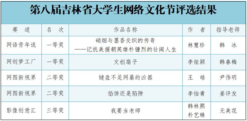 在第八届吉林省大学生网络文化节评选中,我校师生荣获“网语青年说”一等奖1项、“网创梦工厂”一等奖1项、“网图新视界”二等奖2项、“影像创意汇”三等奖1项;在第八届吉林省高校网络教育优秀作品推选展示活动中,我校师生荣获“优秀微课”一等奖1项,优秀“AI+思政”作品一等奖1项、三等奖1项,优秀“新媒体作品”二等奖1项、三等奖1项,优秀“网络文章”三等奖1项。