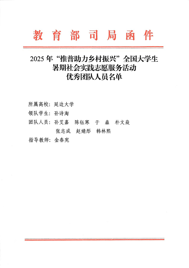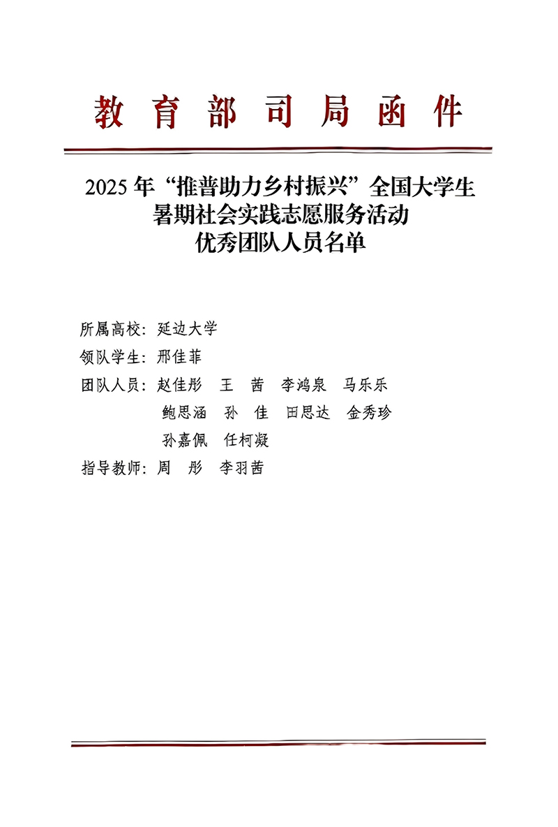 延边大学2支团队获评2025年全国大学生“推普助力乡村振兴”暑期社会实践志愿服务活动“优秀团队”