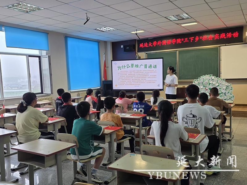 外国语学院“乡音筑梦”推普实践团立足延边州文化特色,发挥专业优势打造接地气、有温度、见实效的实践活动。团队走进中国朝鲜族第一村——和龙市西城镇金达莱村,以“走访调研—深度交流—数据研判—精准建议”四步工作法,摸清乡村文旅产业语言需求,量身定制“语言+文旅”融合方案;同时走进龙井市开山屯镇学校,创新“红色文化+语言教学”模式,通过红色故事宣讲、经典诵读、语言互动游戏等形式,让孩子们在快乐中提升语言能力,厚植爱国情怀。