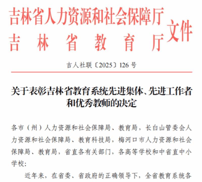 此次荣誉的获得,既是对我校相关集体和个人在教育工作中所作贡献的高度认可,也是对学校以教育教学创新和学科发展为引领,不断提升师资队伍建设成效的充分肯定。学校将以此次表彰为契机,进一步总结经验、发扬成绩,持续深化教育教学改革,大力加强师资队伍建设,全面提升人才培养质量与办学水平。同时,全校师生也将以受表彰的集体和个人为榜样,不忘初心、牢记使命,潜心育人、锐意进取,为推动学校高质量发展、助力吉林省教育事业进步作出新的更大贡献。