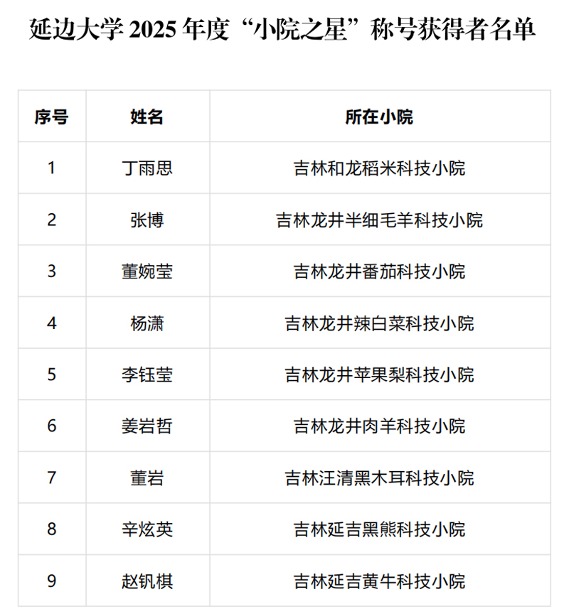 (科学技术处供稿)近日,吉林省农技协发布《关于公布2025年度“小院之星”称号获得者名单的通知》(吉农技协发字〔2025〕8号),经各科技小院推荐、初评、终评及公示等严格程序,我校丁雨思、张博、董婉莹、杨潇、李钰莹、姜岩哲、董岩、辛炫英、赵钒棋9名学子凭借在科技小院的优异表现与突出贡献,荣获2025年度吉林省“小院之星”称号,充分展现了我校学子扎根基层、学以致用、助力乡村振兴的专业素养与实践能力。