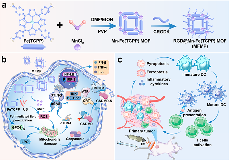 研究针对声动力治疗存在的活性氧生成不足、肿瘤微环境免疫抑制等瓶颈,设计并构建了一种CRGDK修饰的卟啉基双金属Mn-Fe(TCPP)金属有机框架纳米平台,实现铁死亡与cGAS-STING通路介导的抗肿瘤免疫治疗协同增效。研究首次将有序限域结构设计应用于卟啉基双金属MOF的构建,丰富了MOF材料在声动力治疗领域的设计思路;并且在4T1三阴性乳腺癌模型中验证了Mn-Fe(TCPP)的优异疗效,其联合超声不仅能有效抑制原发肿瘤生长,还能显著抑制远处转移和肺转移,诱导长效免疫记忆,为难治性肿瘤的临床治疗提供了一种新型且高效的治疗方案。