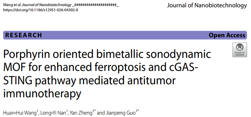 (药学院供稿)近日,药学院药物制剂教学科研团队郭建鹏教授课题组在Top期刊《Journal of Nanobiotechnology》上发表了题为“Porphyrin oriented bimetallic sonodynamic MOF for enhanced ferroptosis and cGAS-STING pathway mediated antitumor immunotherapy”的论文,博士生王焕辉为第一作者。