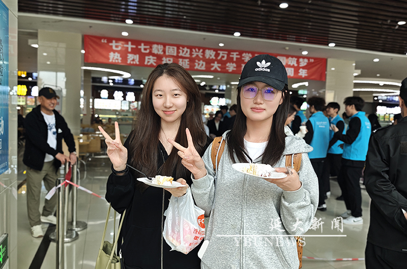 午餐时间,学校食堂内欢声笑语、人潮涌动。“今天是校庆日,学校准备了蛋糕”,来往的师生们兴高采烈地议论着。在延吉校区一食堂二楼、二食堂二楼、三食堂一楼、二楼餐厅,珲春校区食堂餐厅,各摆放着一块大大的蛋糕,上面“庆祝延边大学七十七周年华诞,师生共绘‘双一流’建设蓝图”的字样格外醒目。蛋糕总长度7.7米,象征着学校走过的77个春秋。