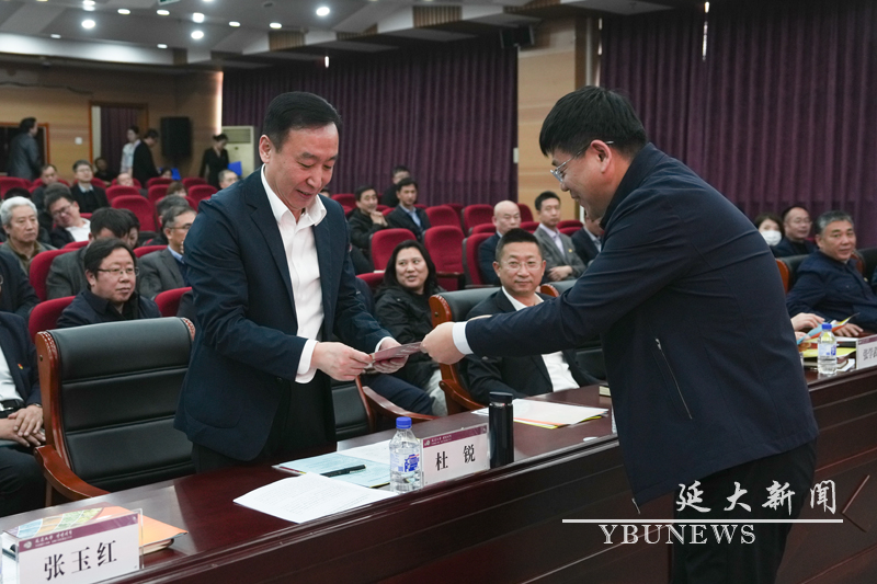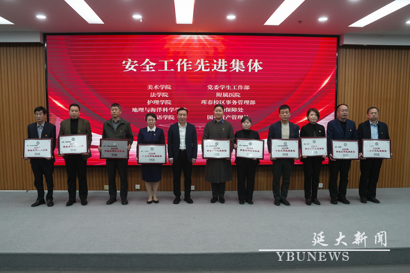 安全保卫处处长尹龙宣读《关于表彰2025年度安全工作先进集体和先进个人的决定》,10个先进集体和9个先进个人获得表彰,杜锐、孙俊奇为获奖集体和个人颁发奖牌和证书。药学院、人文社会科学学院、离退休工作处、图书馆负责人分别代表学院和职能部门向杜锐递交《延边大学2026年度安全工作暨平安校园建设目标责任书》。后勤保障处党委副书记张瑞军、理学院化学系主任太虎林先后代表先进集体和先进个人发言,结合各自开展安全工作情况作经验交流。