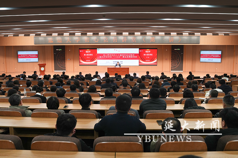 头条新闻 延边大学举办“初心党员讲堂(第一讲)” (通讯员 张宇锋) 12月10日下午,我校以线上线下相结合的形式举办“初心党员讲堂(第一讲)”,校党委书记杜锐作题为《深入贯彻党的二十届四中全会精神,奋力开创学校“十五五”事业发展新局面》的讲座,全校5584名党员参加学习,主会场设在勤学楼圆融报告厅,36个分会场观看线上直播。杜锐首先传达学习党的二十届四中全会精神,从《中共中央关于制定国民经济和社会发展第十五个五年规划的建议》制定入手,深入阐述了“十五五...