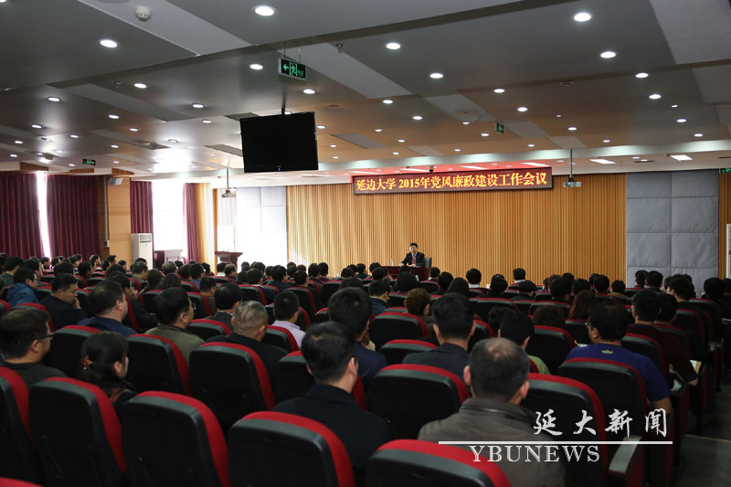 (张宇锋)3月25日下午,我校在科技图书馆八楼召开2015年党风廉政建设工作会议。全体校领导,各部门、学院负责人、重点岗位科级干部,各级人大代表、政协委员及校研究生会和学生会主席、副主席等参加会议。会议由校长朴永浩主持。