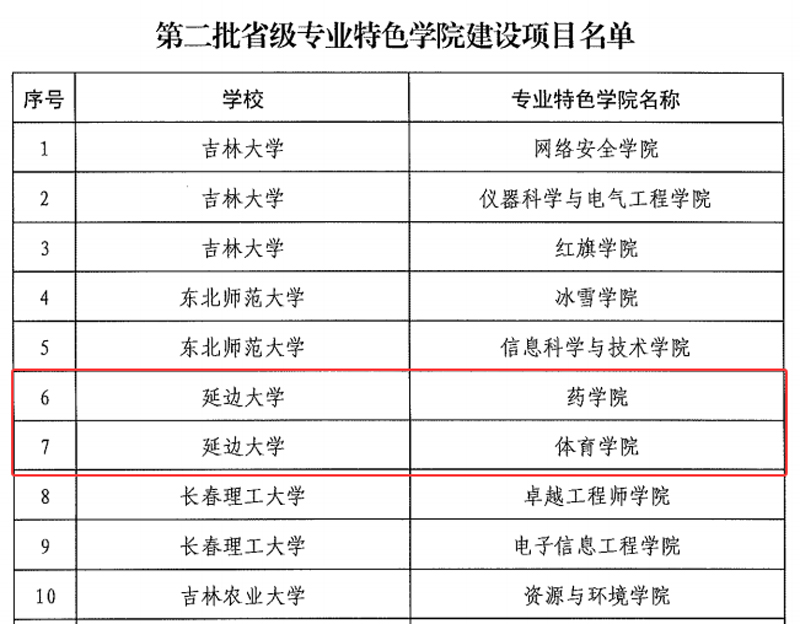 (通讯员 高子愉)近日,吉林省教育厅印发《关于公布第二批省级专业特色学院建设项目名单的通知》,经高校自主申报、材料审核、专家论证,全省35个学院被确定为第二批省级专业特色学院建设项目,延边大学药学院和体育学院成功入选。