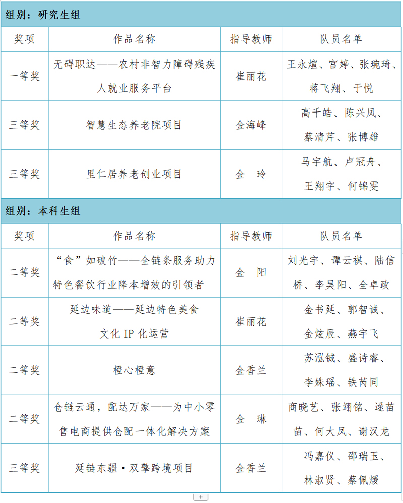 (教务处供稿)近日,由中国贸促会商业行业委员会、中国国际商会商业行业商会和中国商业经济学会共同主办的全国高校商业精英挑战赛创新创业竞赛落下帷幕。延边大学参赛队伍凭借扎实的专业功底、创新的项目设计和出色的现场表现脱颖而出,累计斩获国家级一等奖1项、二等奖4项、三等奖3项,学校荣获“最佳院校组织奖”。