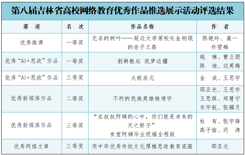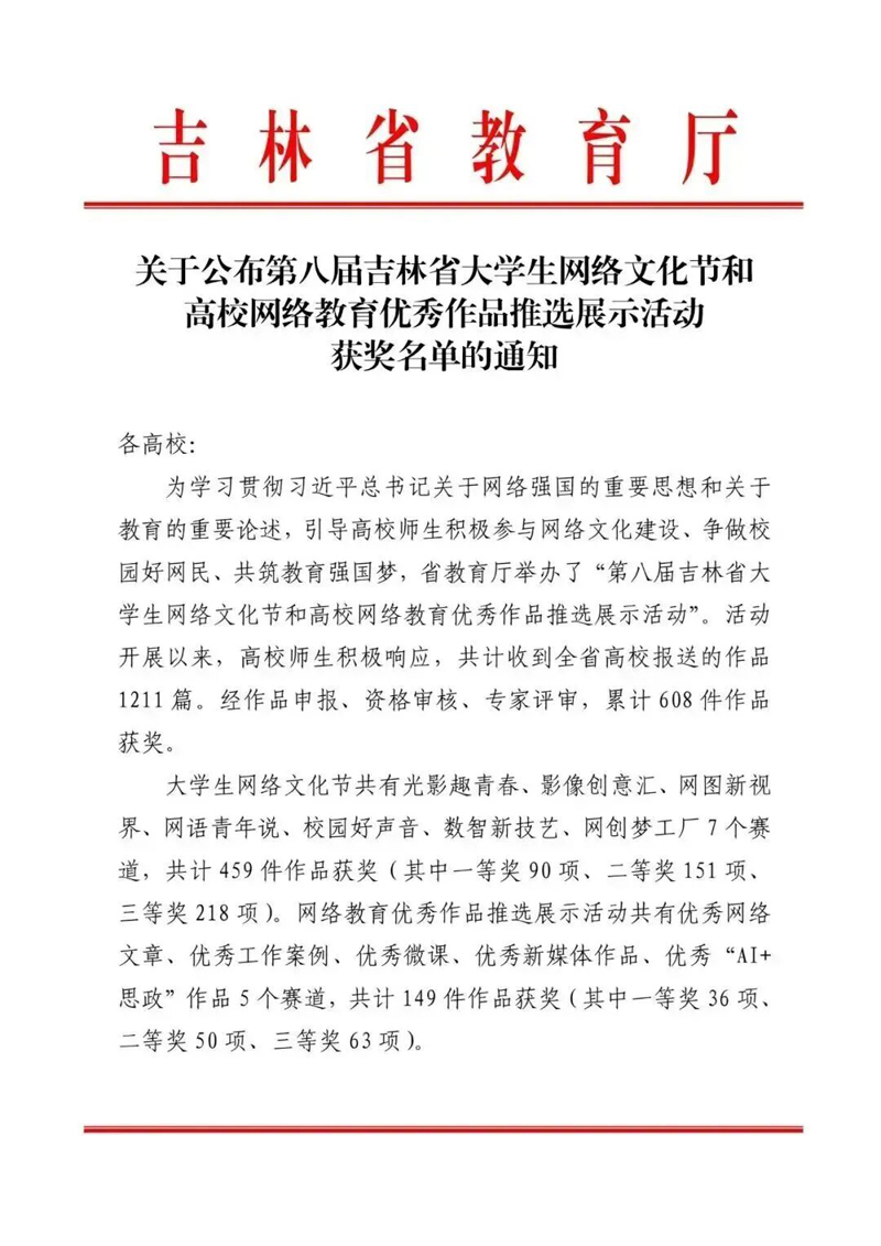 在第八届吉林省大学生网络文化节评选中,我校师生荣获“网语青年说”一等奖1项、“网创梦工厂”一等奖1项、“网图新视界”二等奖2项、“影像创意汇”三等奖1项;在第八届吉林省高校网络教育优秀作品推选展示活动中,我校师生荣获“优秀微课”一等奖1项,优秀“AI+思政”作品一等奖1项、三等奖1项,优秀“新媒体作品”二等奖1项、三等奖1项,优秀“网络文章”三等奖1项。