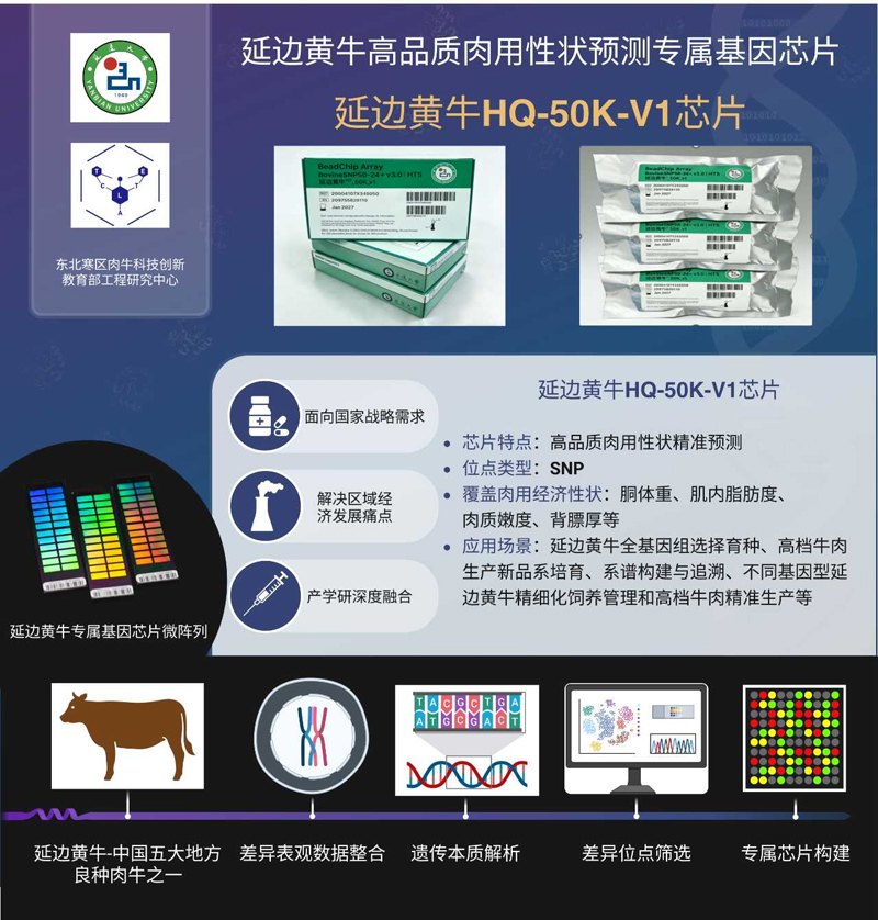 (科技处供稿)近日,我校东北寒区肉牛科技创新教育部工程研究中心与延边弘朝集团延边黄牛研究院等组成的校企联合攻关团队取得了重大突破,成功研制出我国首款延边黄牛高品质肉用性状预测专属基因芯片——“延边黄牛HQ-50K-V1”。该成果为延边黄牛品种保护、优质种源培育与高档牛肉高质量生产提供了强有力的技术支持,标志着我校在服务国家种业振兴战略和地方特色经济发展方面迈出了坚实而重要的一步。