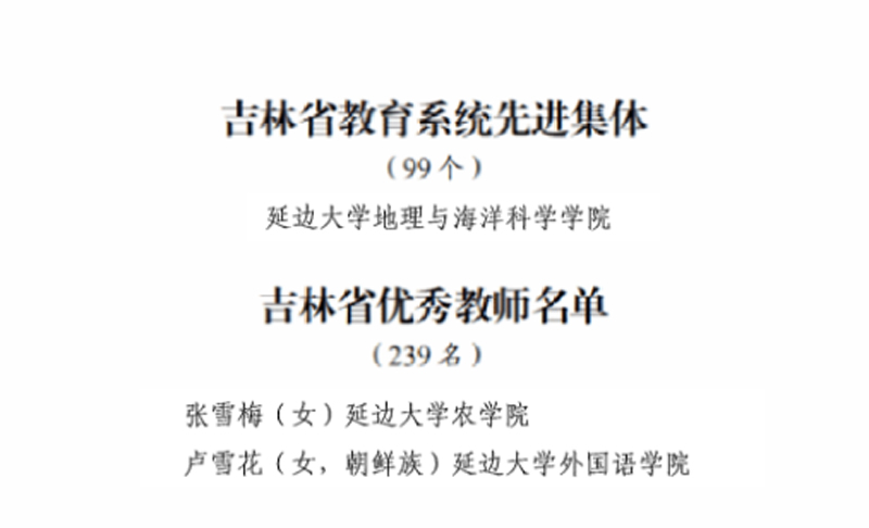 (人力资源管理处供稿)近日,吉林省人力资源和社会保障厅、吉林省教育厅联合发布《关于表彰吉林省教育系统先进集体、先进工作者和优秀教师的决定》(吉人社联〔2025〕126号),对近年来在全省教育事业中作出突出贡献的集体和个人进行表彰。我校地理与海洋科学学院荣获“吉林省教育系统先进集体”称号,农学院张雪梅、外国语学院卢雪花荣获“吉林省优秀教师”称号。