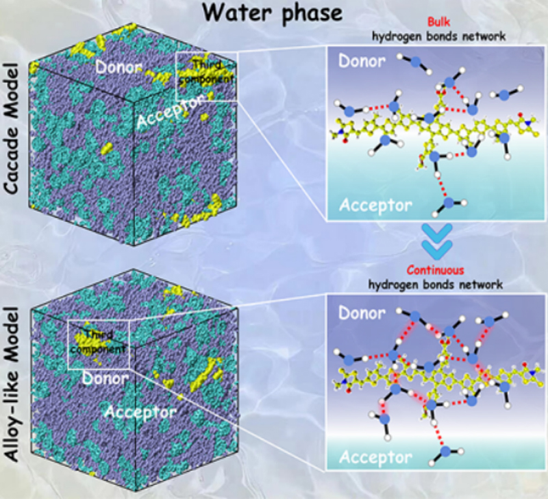 有机太阳能电池是一项绿色新能源的重要变革技术,具有柔性轻薄、可溶液加工和适于规模化制备等优势,在新型能源器件和未来智慧能源体系中展现出广阔应用前景。但是在电池制备过程中局限于无水无氧的严苛条件,使得成本居高不下,是影响其商业化进程的重要因素之一。在这项工作中聚焦典型多组分、强非平衡的三元有机活性层,揭示了微量水并非传统认知中的影响其光电转换效率的惰性杂质,而是可以通过精准控制水含量的阈值,能够形成连续的氢键网络,参与分子堆积与相分离过程。该结论从机制层面明晰了微量溶剂组分对有机半导体形貌演化的影响路径,深化了对非共价相互作用在材料自组装中功能的理解;在应用与转化层面,提出的共溶剂策略突破了该领域长期对水严格规避的经验局限,成功将水从“干扰因素”转化为可精确利用的“形貌调控工具”,实现了从被动“避水”到主动“用水”的范式转变。这一策略为有机光伏领域内溶液加工提供了新的环境变量与控制维度,对提升器件性能稳定性、发展绿色制备工艺、降低器件制备成本、加速其商业化具有明确的科学意义和应用价值。