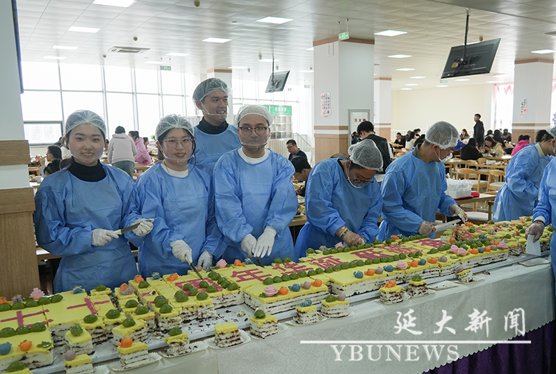 午餐时间,学校食堂内欢声笑语、人潮涌动。“今天是校庆日,学校准备了蛋糕”,来往的师生们兴高采烈地议论着。在延吉校区一食堂二楼、二食堂二楼、三食堂一楼、二楼餐厅,珲春校区食堂餐厅,各摆放着一块大大的蛋糕,上面“庆祝延边大学七十七周年华诞,师生共绘‘双一流’建设蓝图”的字样格外醒目。蛋糕总长度7.7米,象征着学校走过的77个春秋。