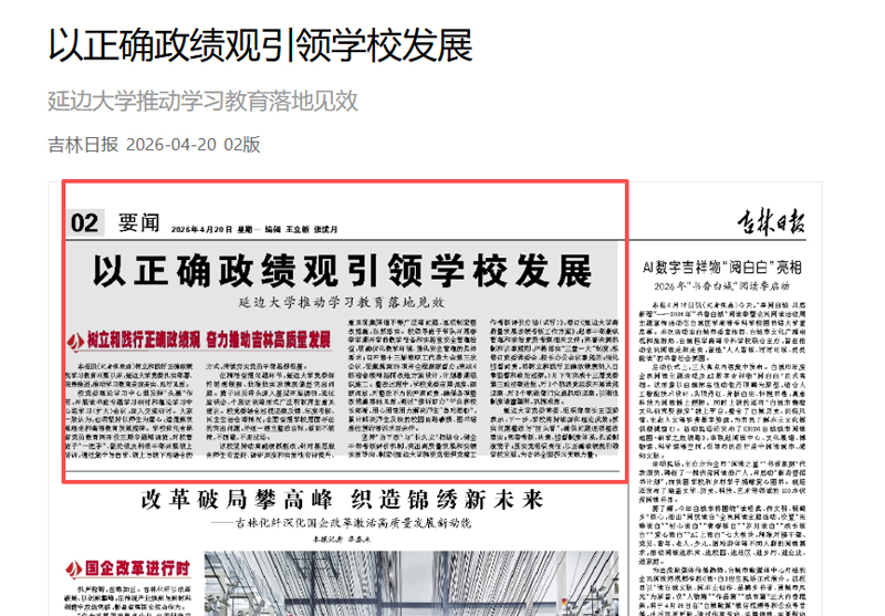 《吉林日报》在2版要闻版面刊发题为《以正确政绩观引领学校发展》的文章,对学校开展树立和践行正确政绩观学习教育以来的具体举措与阶段性成果进行了详细报道。报道指出,延边大学党委精准查摆问题、坚持动真碰硬抓整改、坚持“当下改”与“长久立”相结合,扎实部署、统筹推进,推动学习教育走深走实、见行见效。